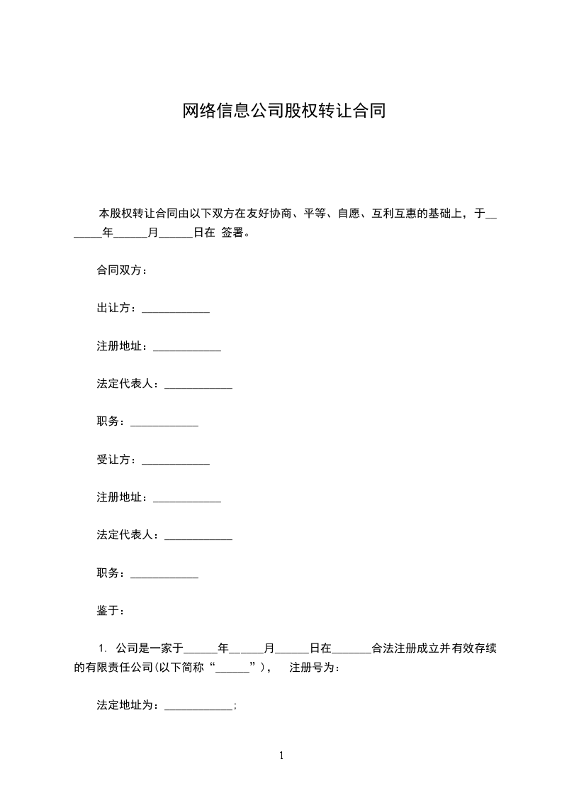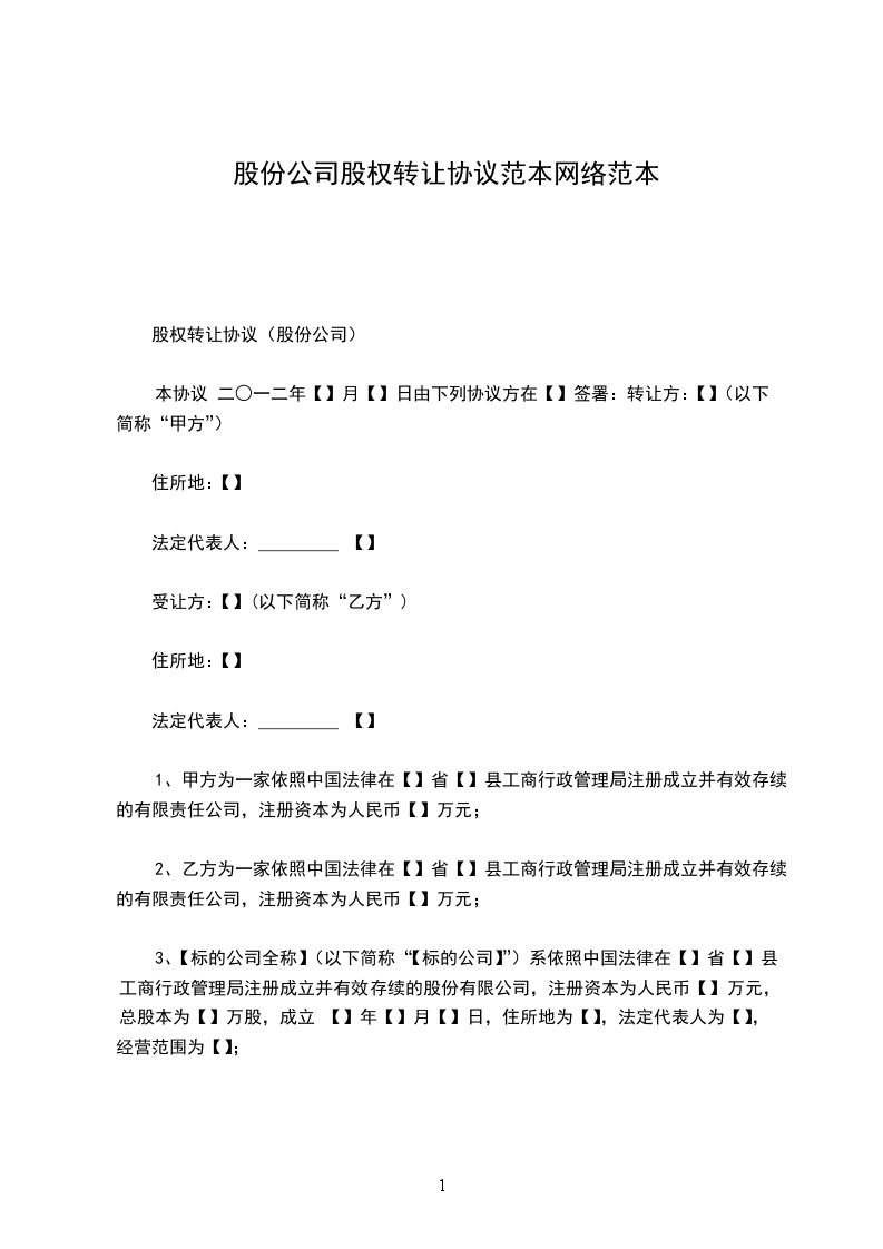 1、甲、乙双方同意并确认,本合同项下的股权转让价款为¥________万元人民币(大写:人民币________________元)。
