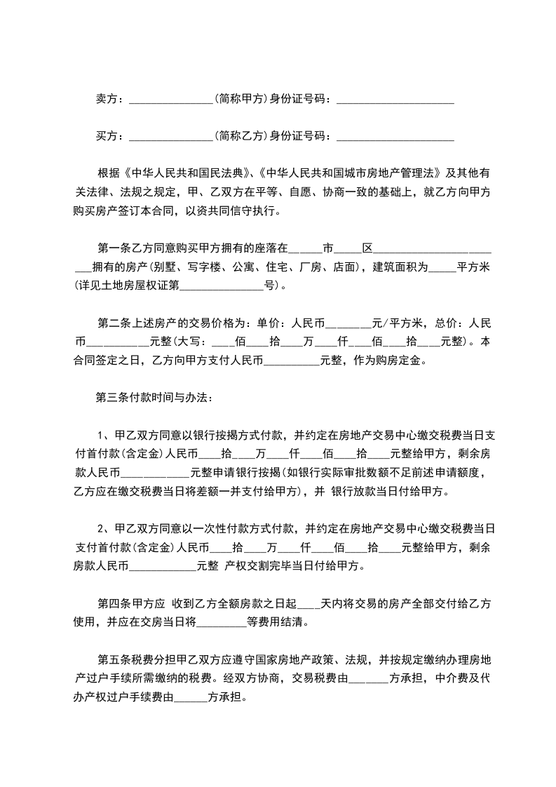 第一条乙方同意购买甲方拥有的座落在______市_____区________________________拥有的房产(别墅、写字楼、公寓、住宅、厂房、店面),建筑面积为_____平方米。(详见土地房屋权证第_______________号)。
