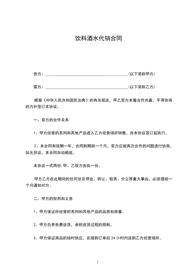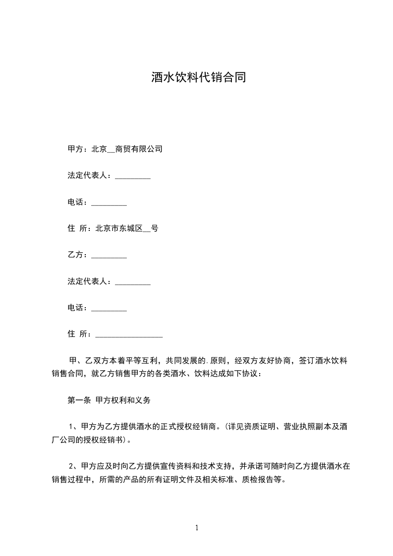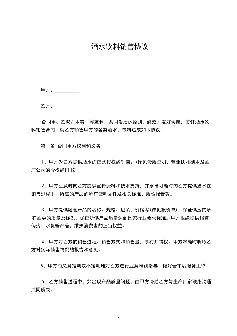⑤、乙方购进的产品如果销售不畅,任何品牌的酒水,甲方有义务随时可调换别的产品或原价办理退货,同时,对于饮料产品,甲方应在过保质期前的半个月内应乙方要求办理退货。