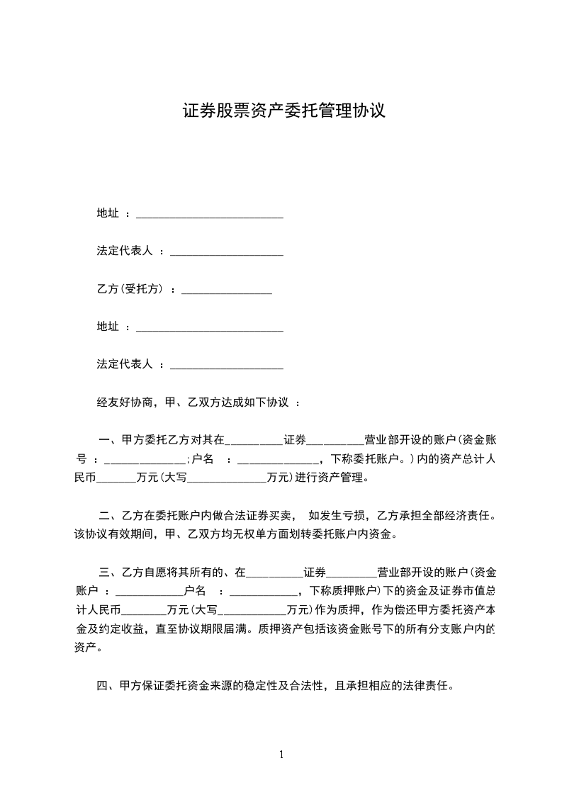 一、甲方委托乙方对其在__________证券__________营业部开设的账户(资金账号 :______________;户名 :______________,下称委托账户。)内的资产总计人民币_______万元(大写______________万元)进行资产管理。