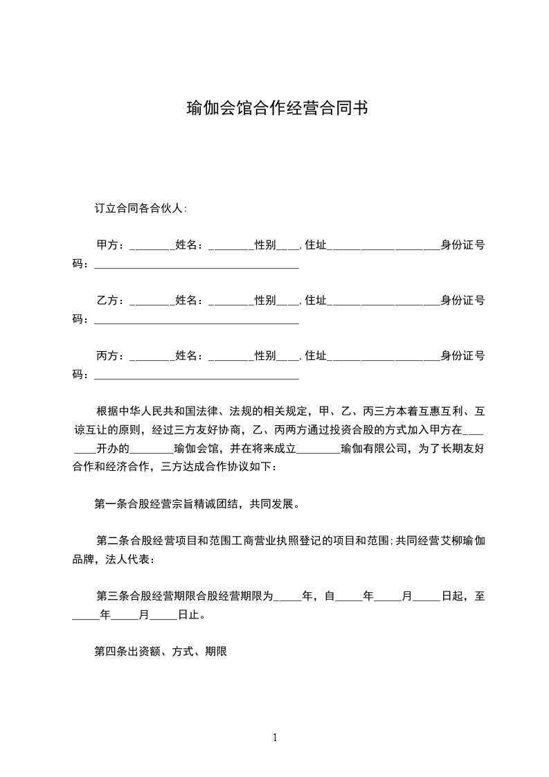 根据中华人民共和国法律、法规的相关规定,甲、乙、丙三方本着互惠互利、互谅互让的原则,经过三方友好协商,乙、丙两方通过投资合股的方式加入甲方在________开办的________瑜伽会馆,并在将来成立________瑜伽有限公司,为了长期友好合作和经济合作,三方达成合作协议如下: