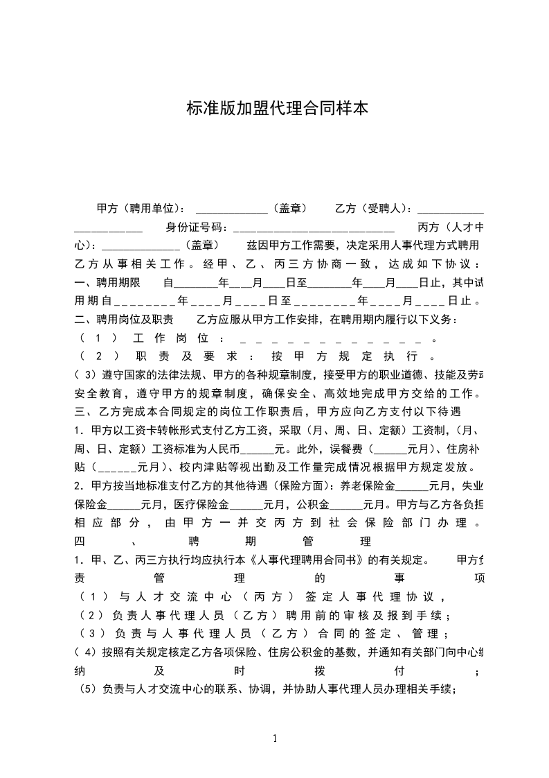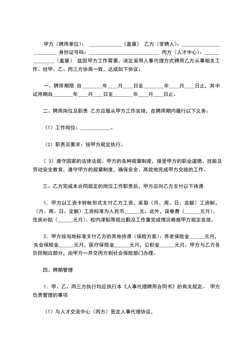 甲方(聘用单位): _____________(盖章) 乙方(受聘人):________________________ 身份证号码:____________________________ 丙方(人才中心):______________(盖章) 兹因甲方工作需要,决定采用人事代理方式聘用乙方从事相关工作。经甲、乙、丙三方协商一致,达成如下协议:
