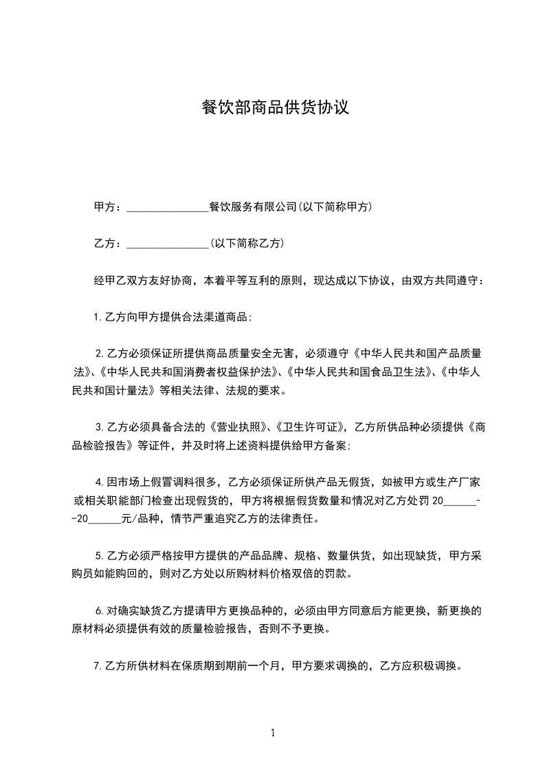 4.因市场上假冒调料很多,乙方必须保证所供产品无假货,如被甲方或生产厂家或相关职能部门检查出现假货的,甲方将根据假货数量和情况对乙方处罚20______--20______元/品种,情节严重追究乙方的法律责任。