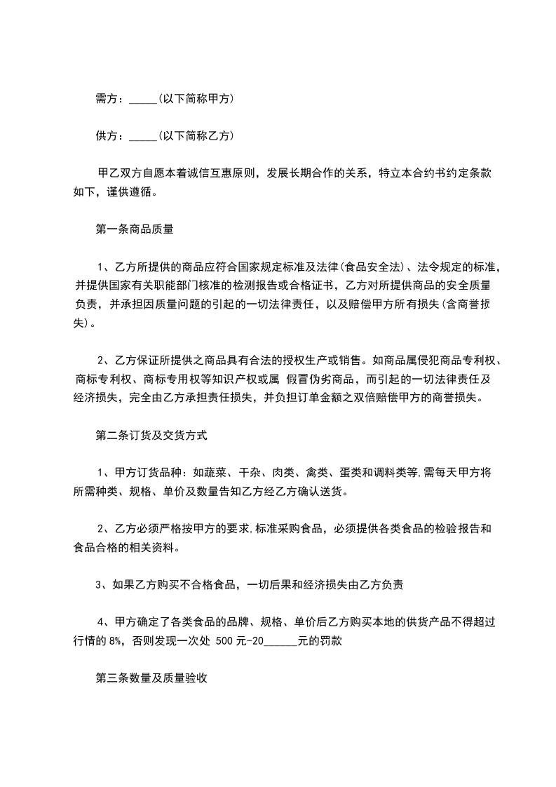 3.乙方必须具备合法的《营业执照》、《卫生许可证》,乙方所供品种必须提供《商品检验报告》等证件,并及时将上述资料提供给甲方备案;