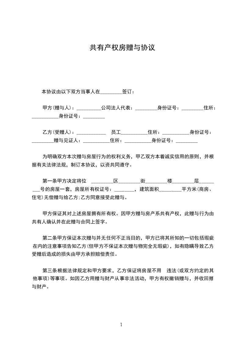甲方保证其对上述房屋拥有所有权。因甲方赠与房产系共有产权,此赠与行为由共有人确认并在此赠与合同上签字。