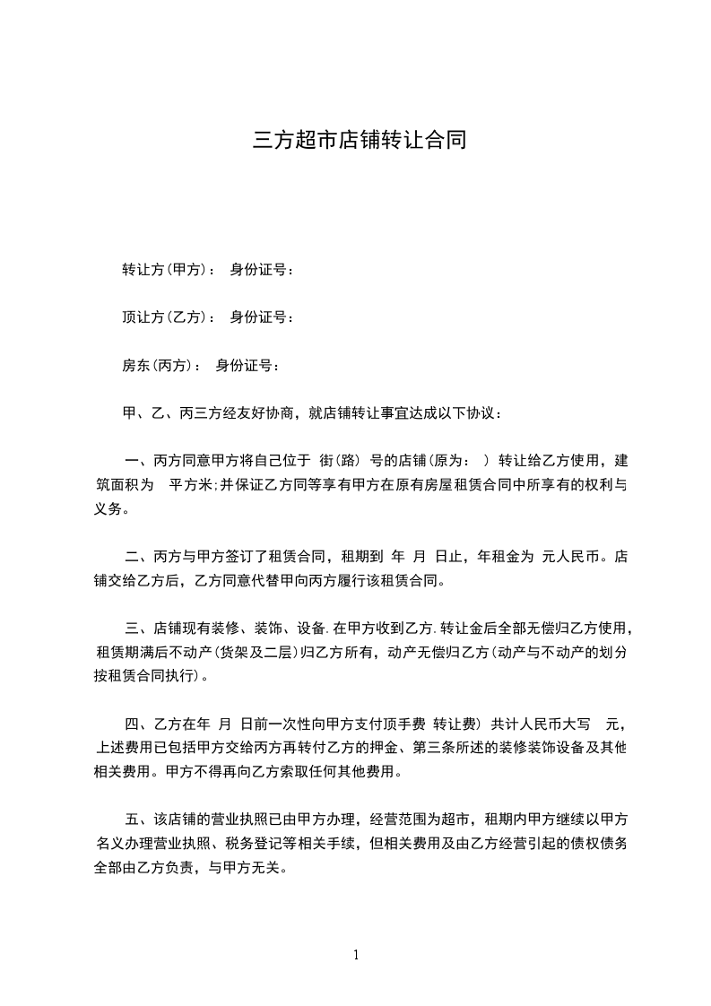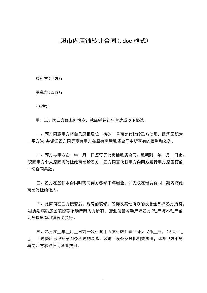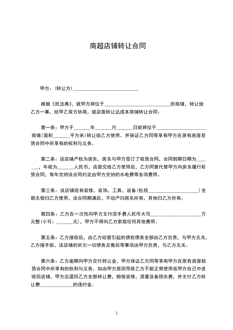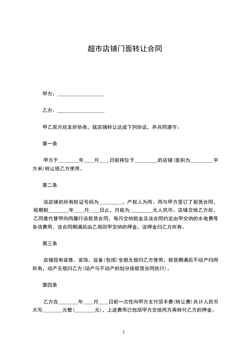 第一条 甲方 ____年____ 月 ____日前将位 __________店铺(面积为__平方米)转让给乙方使用。