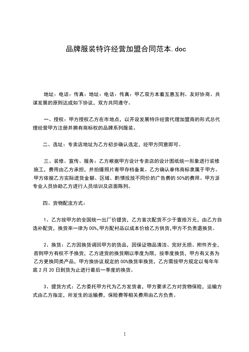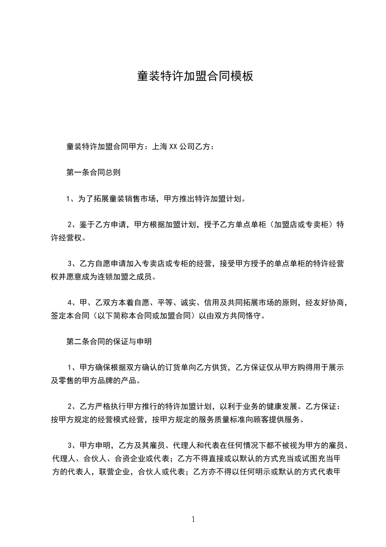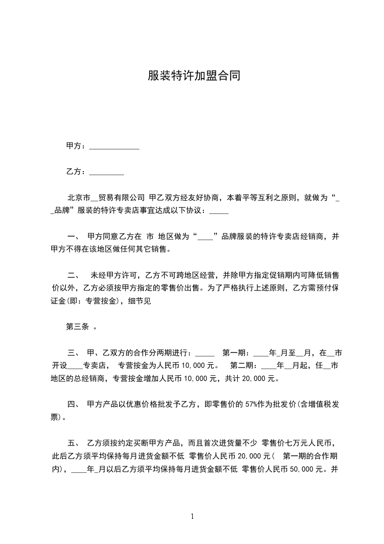 一、 甲方同意乙方在 市 地区做为“____”品牌服装的特许专卖店经销商,并甲方不得在该地区做任何其它销售。