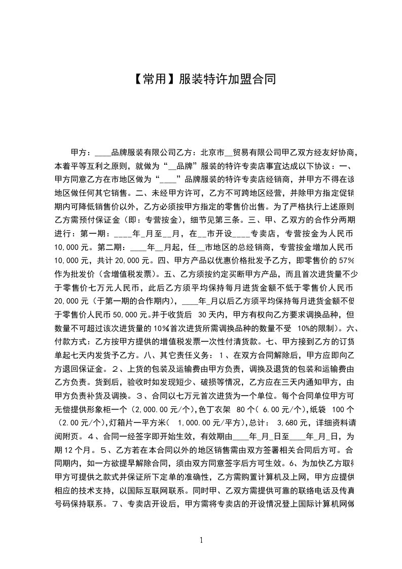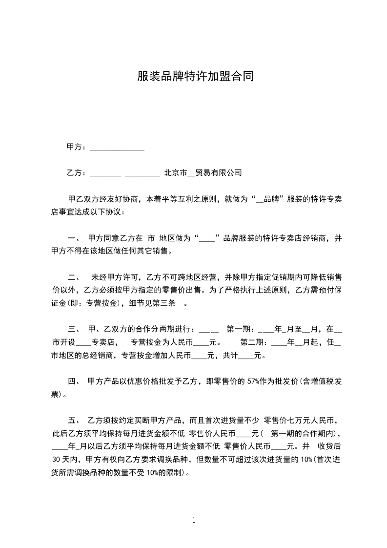 北京市__贸易有限公司 甲乙双方经友好协商,本着平等互利之原则,就做为“__品牌”服装的特许专卖店事宜达成以下协议:_____