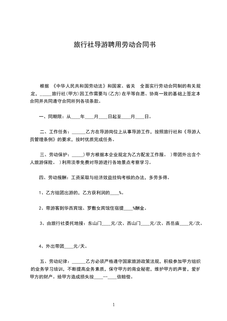 五、劳动纪律:______乙方必须严格遵守国家旅游政策法规,积极参加甲方组织的业务学习培训,不断提高业务素质,保守甲方的商业秘密,维护甲方的声誉,爱护甲方的财产。给甲方造成损失按____--____倍赔偿。