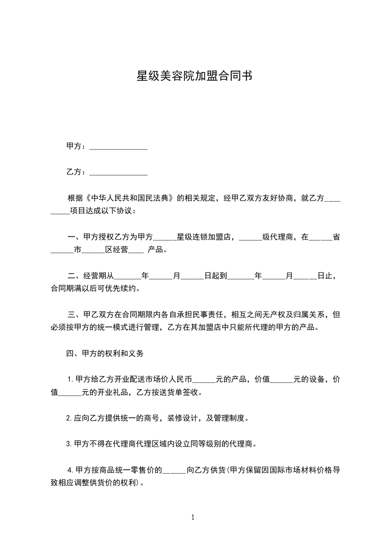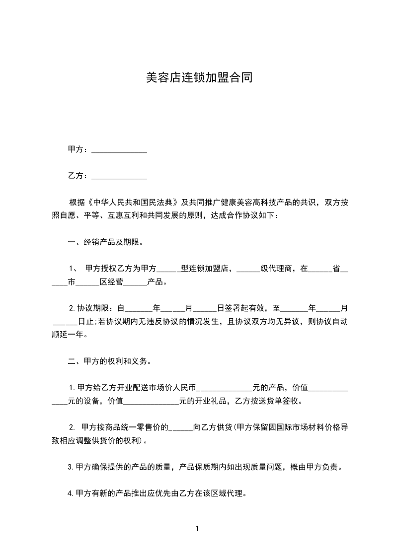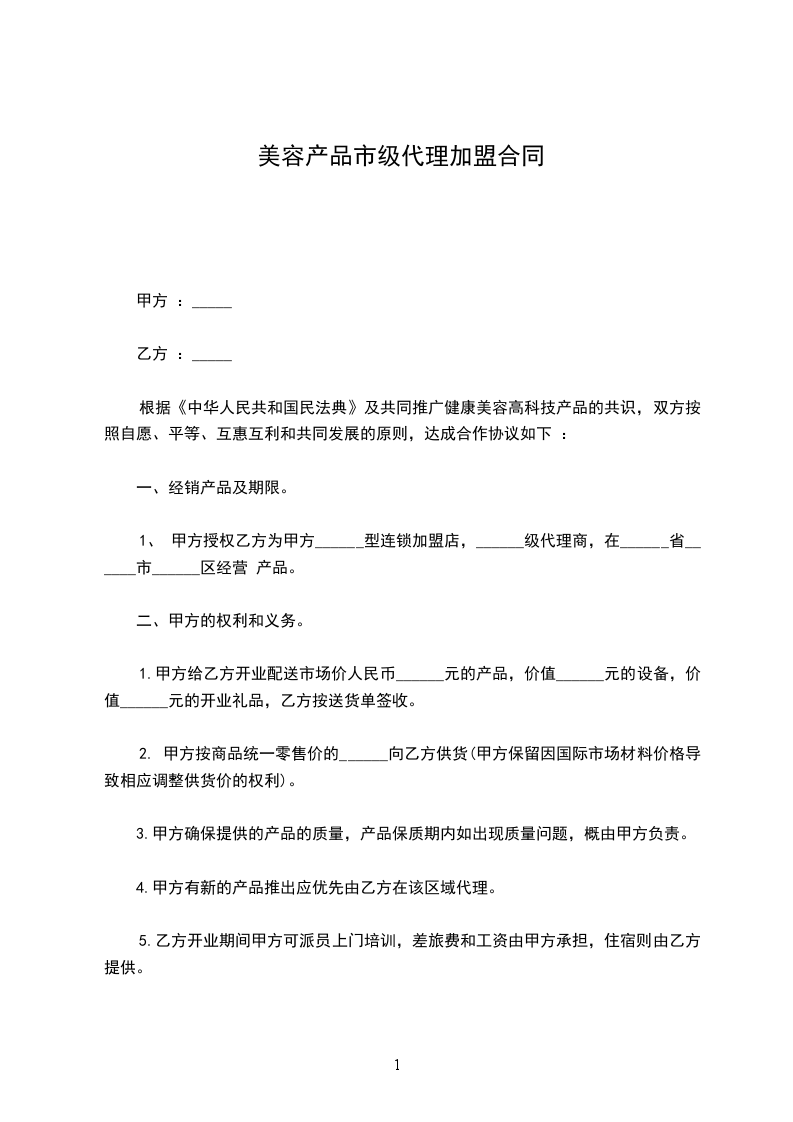 1、 甲方授权乙方为甲方______型连锁加盟店,______级代理商,在______省______市______区经营 产品。