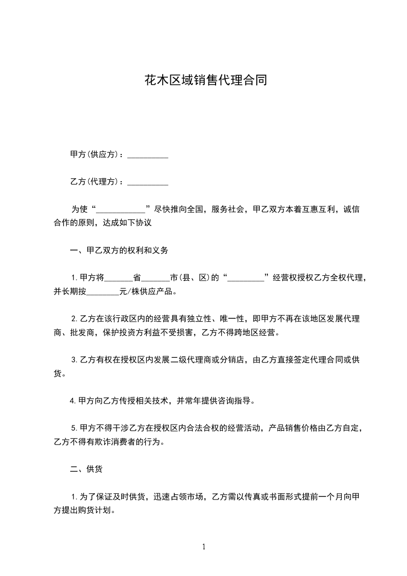 1.甲方将_______省_______市(县、区)的“_________”经营权授权乙方全权代理,并长期按________元/株供应产品。
