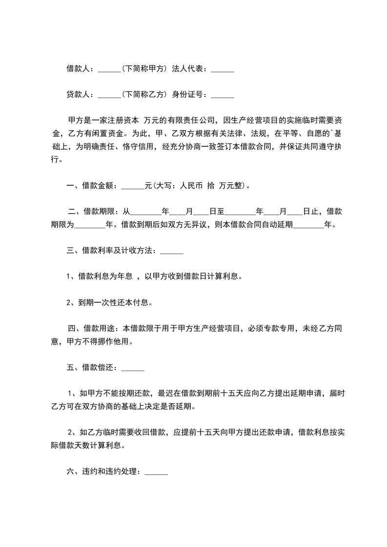 甲方是一家注册资本 万元的有限责任公司,因生产经营项目的实施临时需要资金,乙方有闲置资金。为此,甲、乙双方根据有关法律、法规,在平等、自愿的基础上,为明确责任、恪守信用,经充分协商一致签订本借款合同,并保证共同遵守执行。