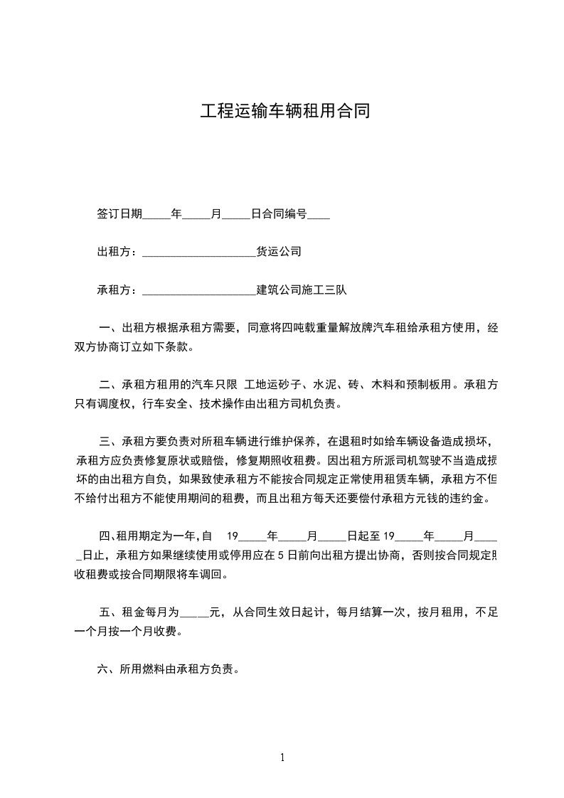 一、出租方根据承租方需要,同意将四吨载重量解放牌汽车租给承租方使用,经双方协商订立如下条款。