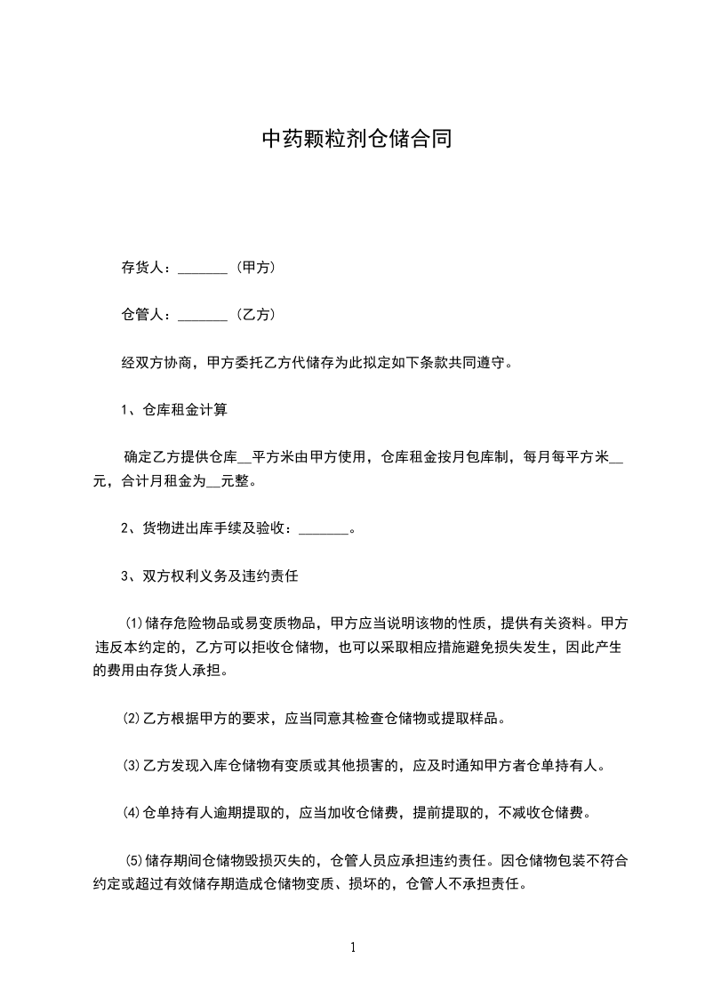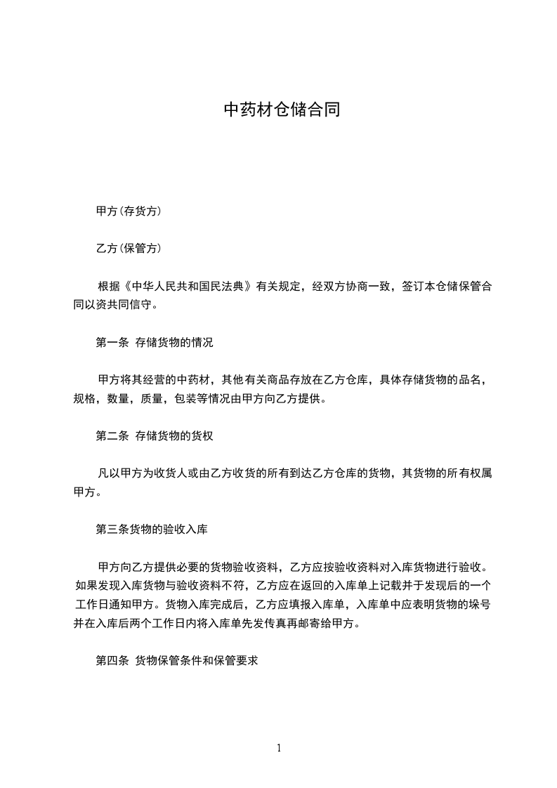 甲方将其经营的中药材,其他有关商品存放在乙方仓库,具体存储货物的品名,规格,数量,质量,包装等情况由甲方向乙方提供。