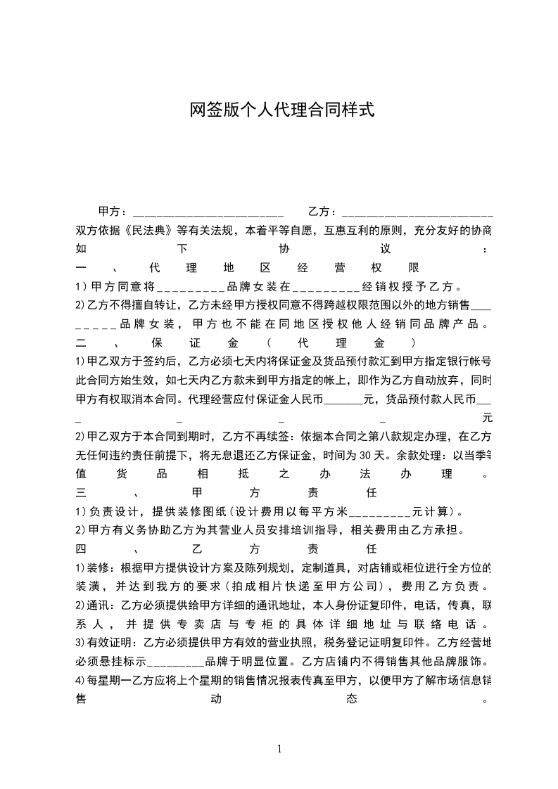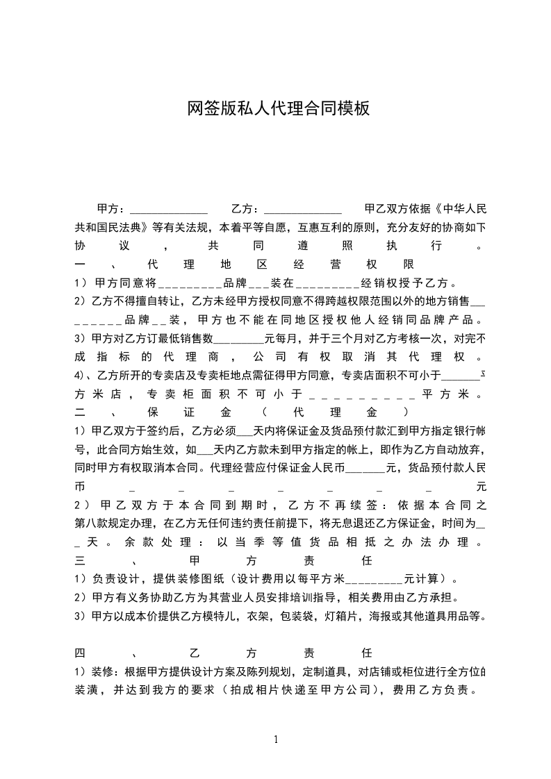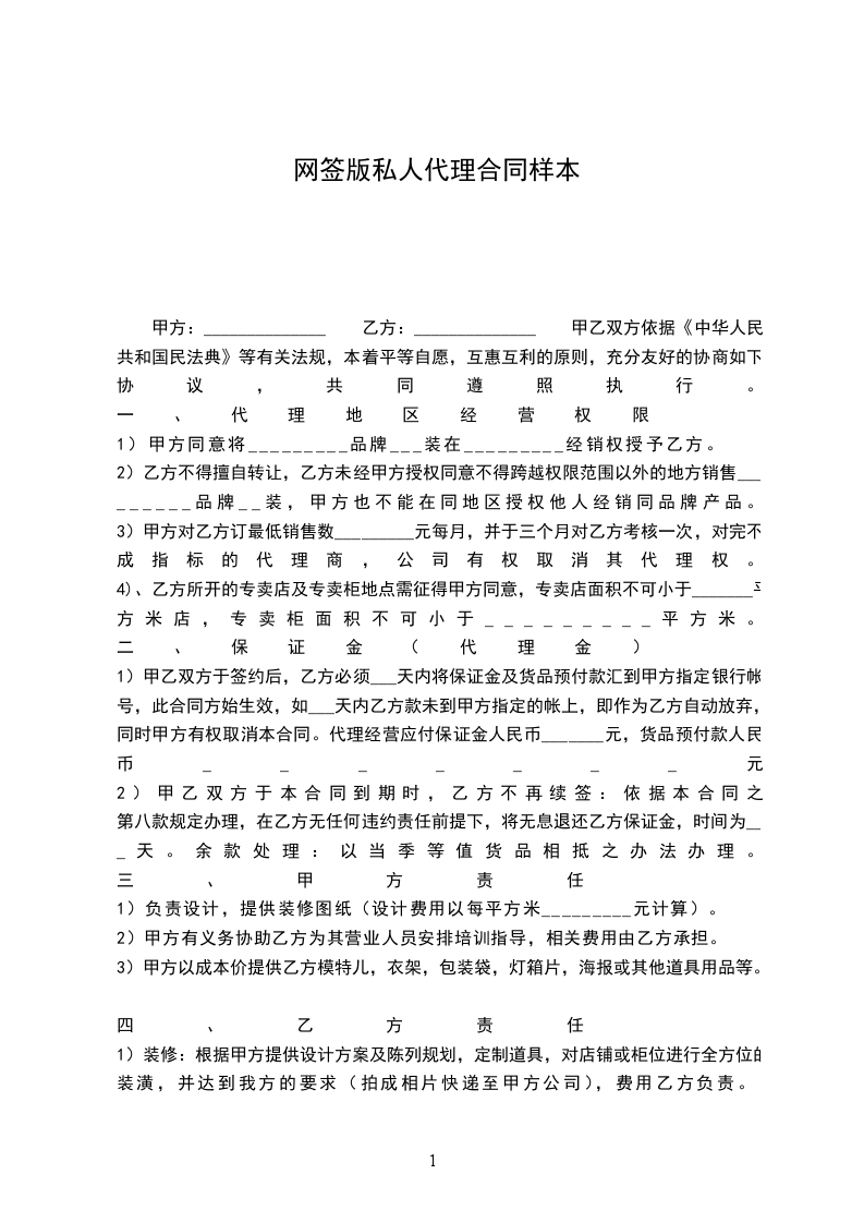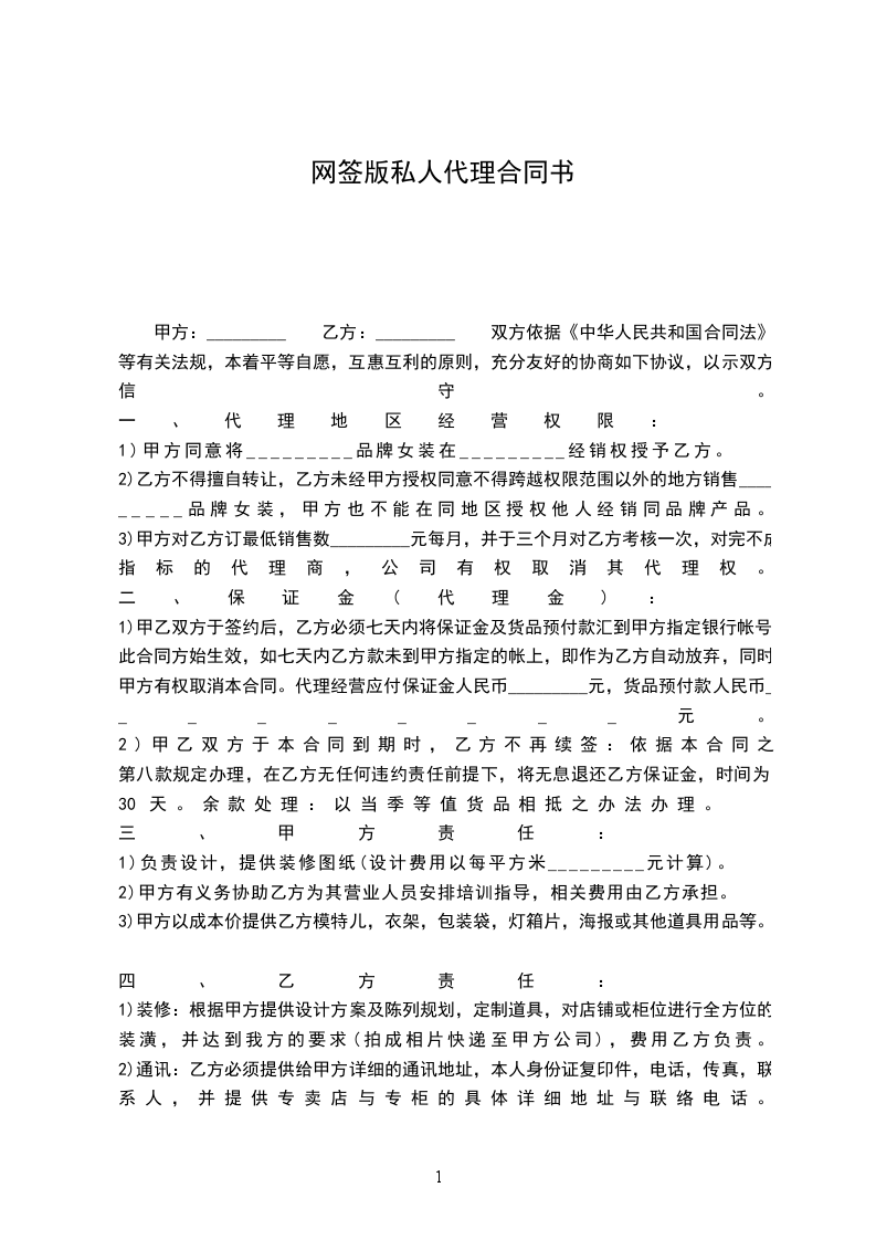 四、本合同一式贰份,甲乙双方各执壹份,经双方签字,公司盖章后,乙方保证金和货品预付款到达甲方帐号上方始生效。 甲方(盖章):_______________ 乙方(盖章):_______________ 委托代理人(签字):_________ 委托代理人(签字):_________ ________年____月____日 ________年____月____日 签订地点:___________________ 签订地点:___________________