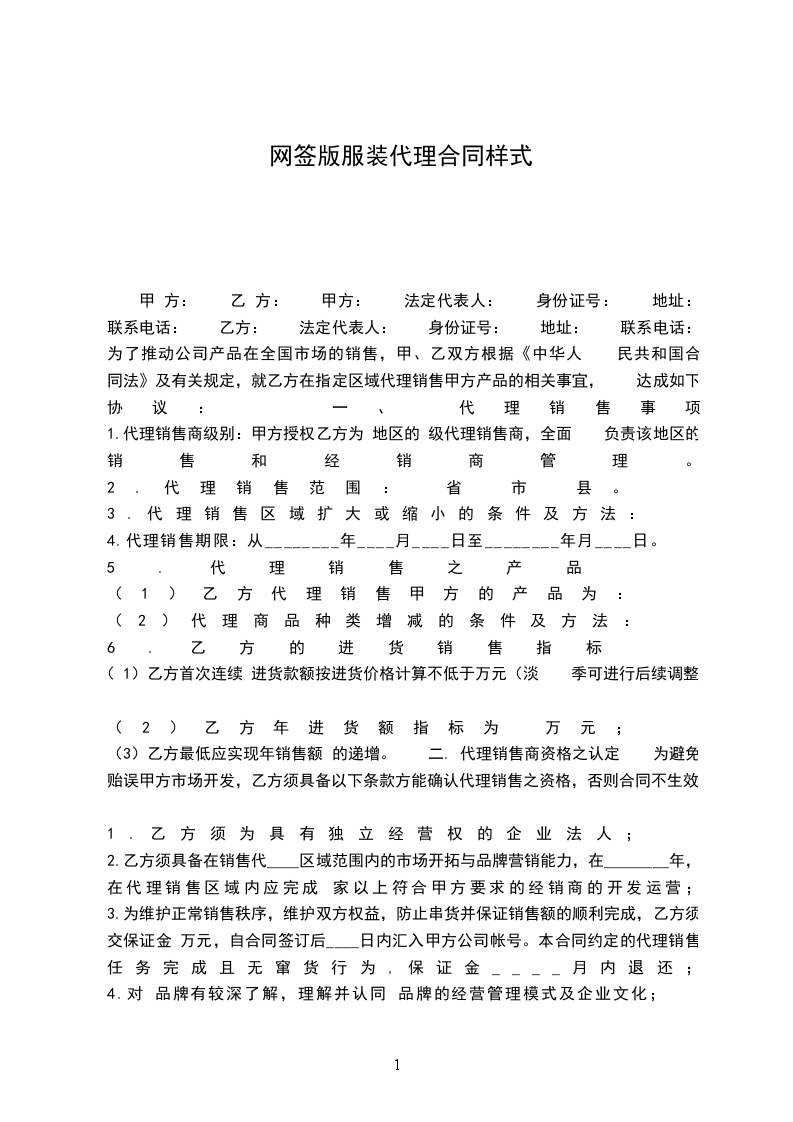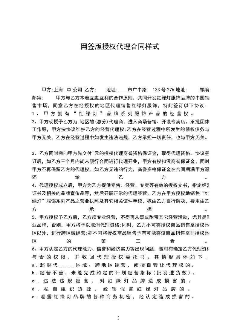 3)有效证明:乙方必须提供甲方有效的营业执照,税务登记证明复印件。乙方经营地必须悬挂标示_________品牌于明显位置。乙方店铺内不得销售其他品牌服饰。