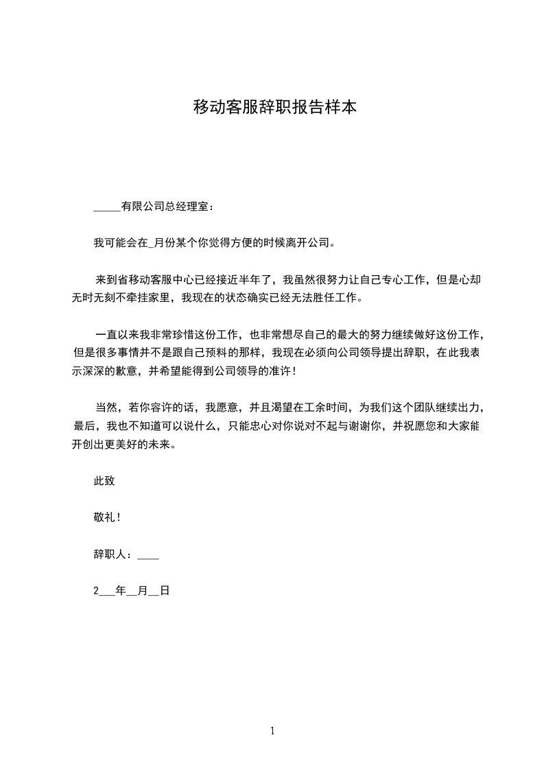 来到省移动客服中心已经接近半年了,正是在这里我开始踏上了社会,完成了自己从一个学生到社会人的转变。这里平等的人际关系和开明的工作作风,让我能开心的工作,开心的学习。但是因为离家比较远,父母近期身体都不好,家里没有人照顾,作为一个女儿我有侍奉双亲的责任,这两天我虽然很努力让自己专心工作,但是心却无时无刻不牵挂家里,我现在的状态确实已经无法胜任工作。正是考虑到这些因素,我郑重向公司提出辞职,希望领导能够批准,另外离开前我也会认真做好现有的工作,把未完成的工作做一下整理,以保证工作的顺利的交接。