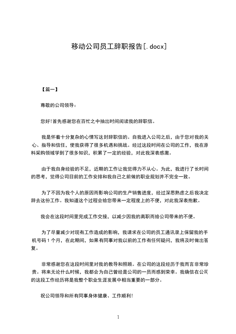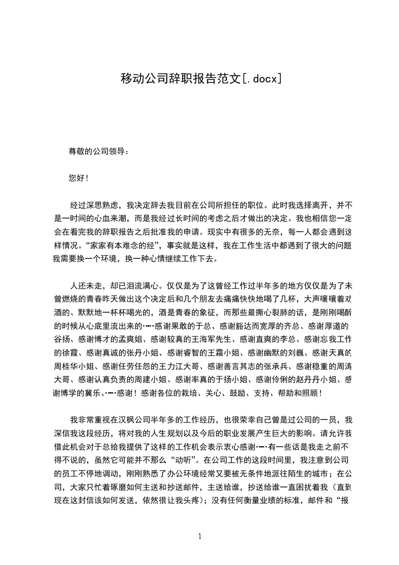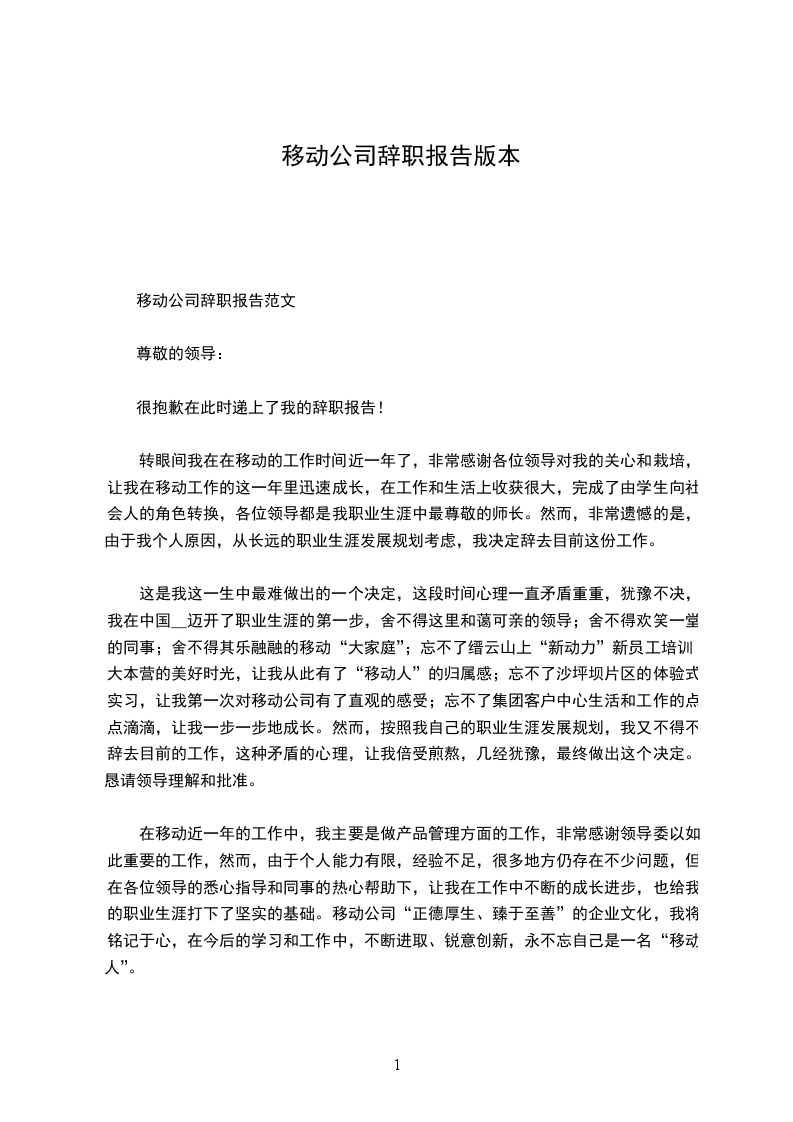 我来到移动公司已经一年半了,正是在这里我开始踏上了社会,完成了从一个学生到社会人的角色转变。非常感谢各位领导对我的关心和栽培,让我在移动工作的这一年半里迅速成长,在工作和生活上收获很大。然而,非常遗憾的是,由 我的个人原因,以及从长远的职业生涯发展规划考虑,我决定辞去目前这份工作。