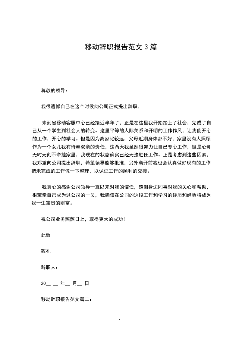 移动辞职报告范文篇三: