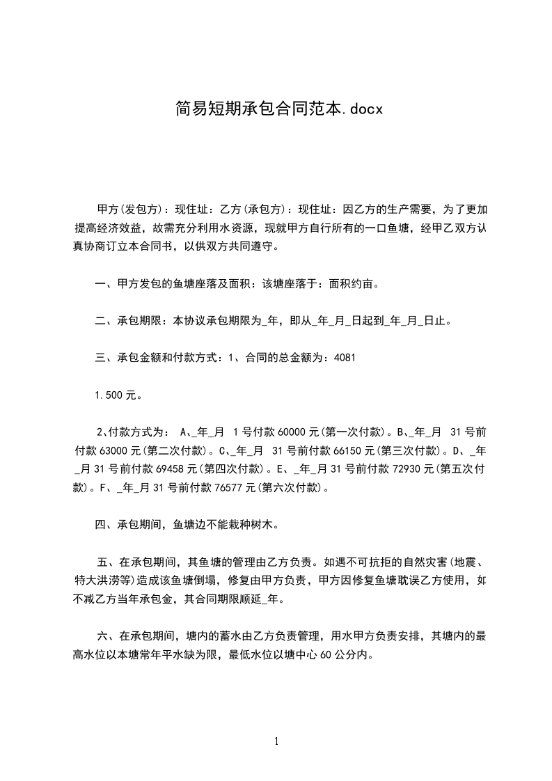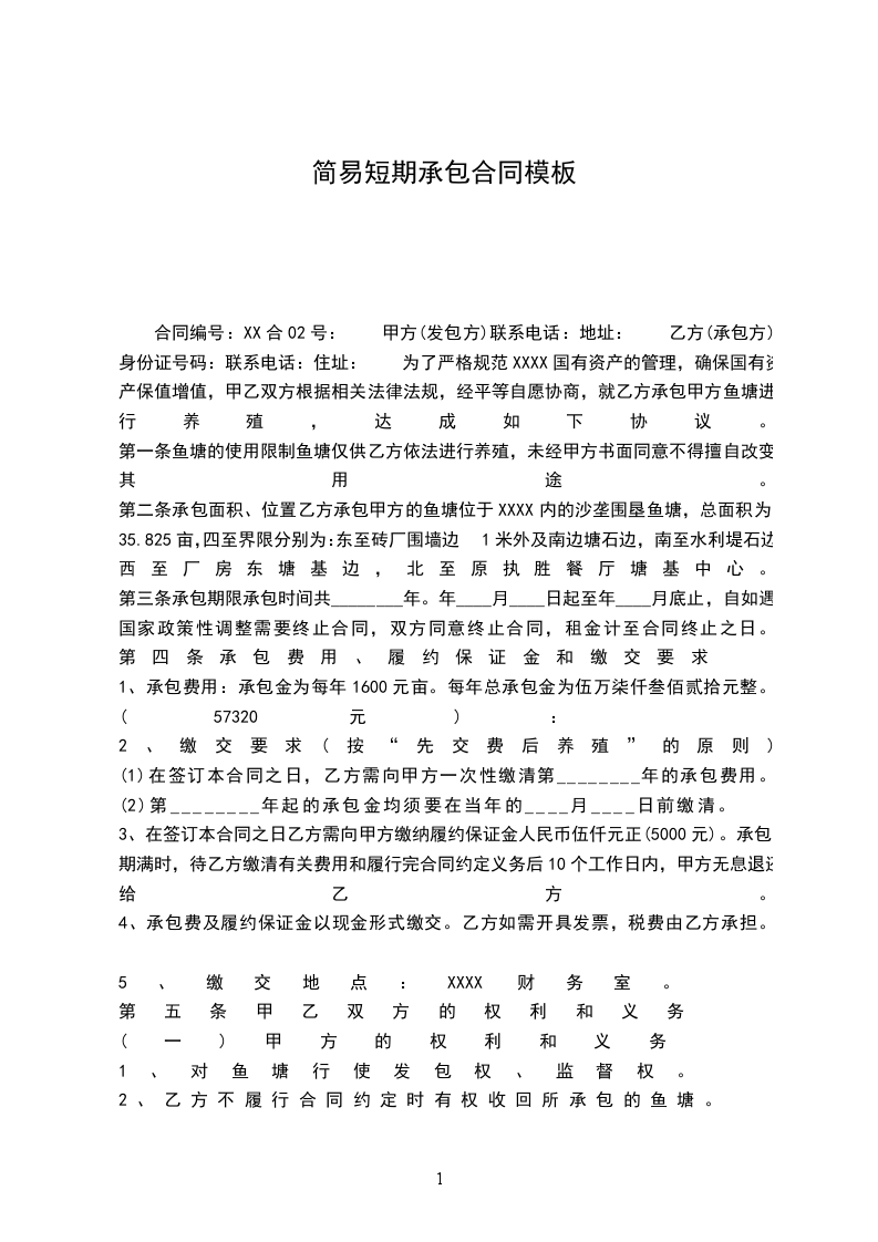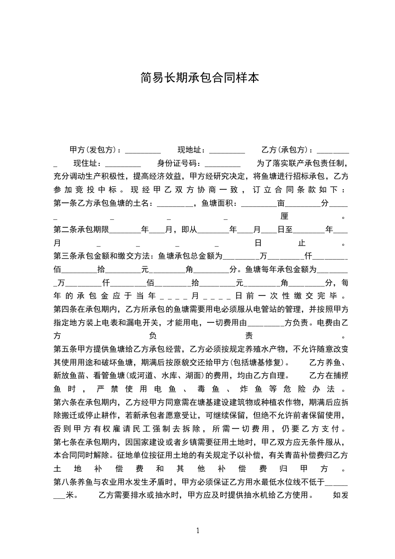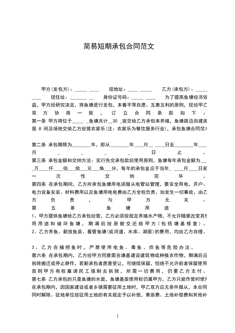 甲方(发包方): 现住址: 乙方(承包方): 现住址: 因乙方的生产需要,为了更加提高经济效益,故需充分利用水资源,现就甲方自行所有的一口鱼塘,经甲乙双方认真协商订立本合同书,以供双方共同遵守。