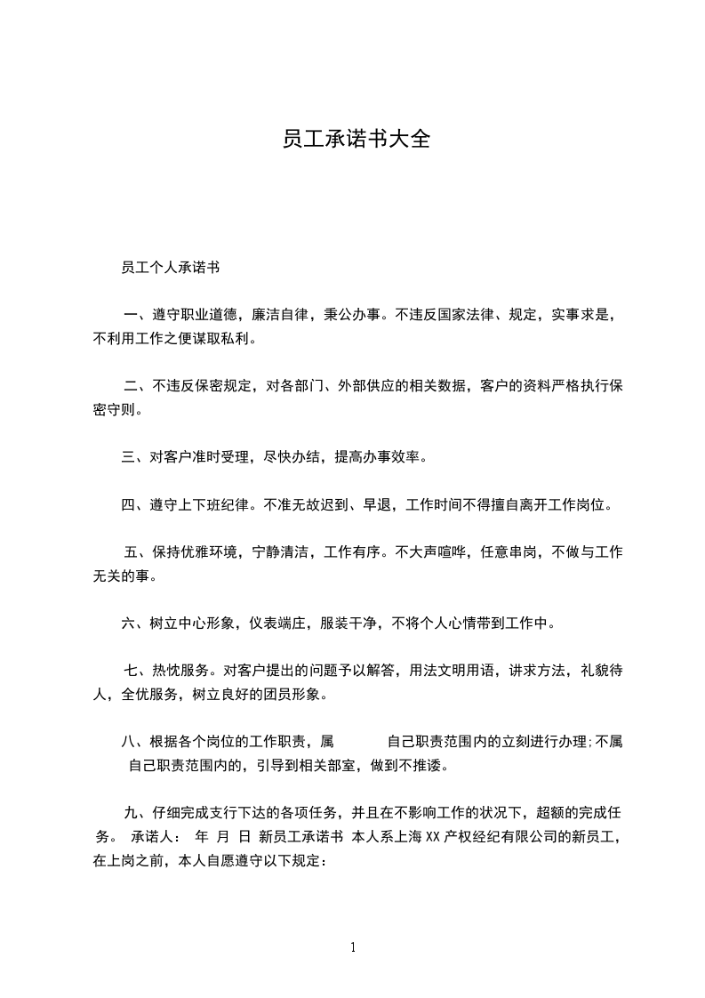 本人系上海__ __ 产权经纪有限公司的新员工,在上岗之前,本人自愿遵守以下规定: