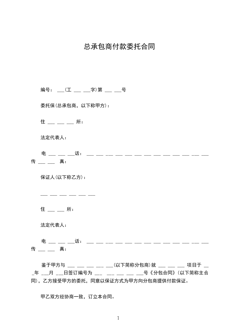 鉴于甲方与____________________(以下简称分包商)就__________项目于________年______月______日签订编号为____________号《分包合同》(以下简称主合同),乙方接受甲方的委托,同意以保证方式为甲方向分包商提供付款保证。甲乙双方经协商一致,订立本合同。