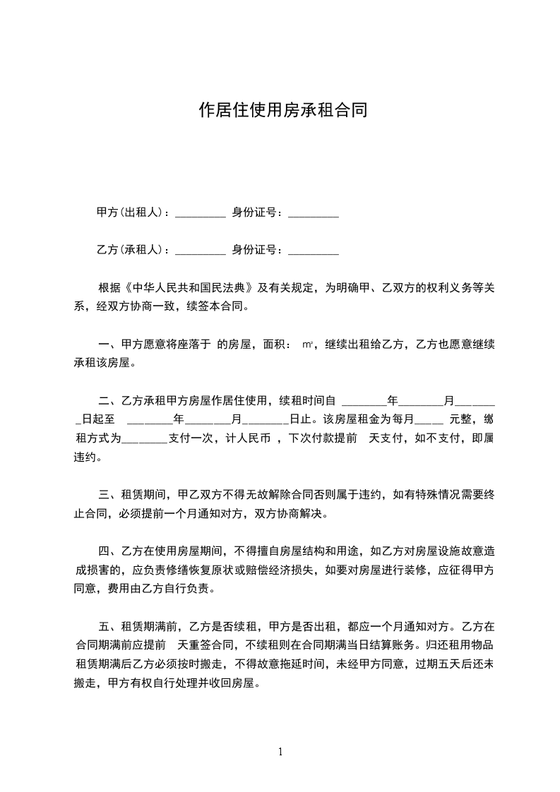 二、乙方承租甲方房屋作居住使用,续租时间自 ________年________月________日起至 ________年________月________日止。该房屋租金为每月_____ 元整,缴租方式为________支付一次,计人民币 ,下次付款提前 天支付,如不支付,即属违约。