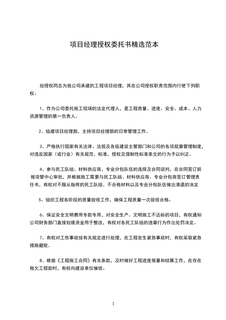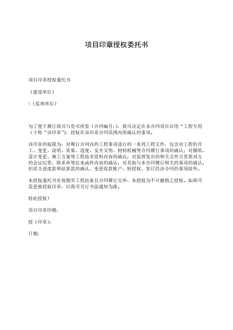 兹授权__ __ __ 同志为我公司承建的__ __ __ __ 工程项目经理,其在公司授权职责范围内行使下列职权:
