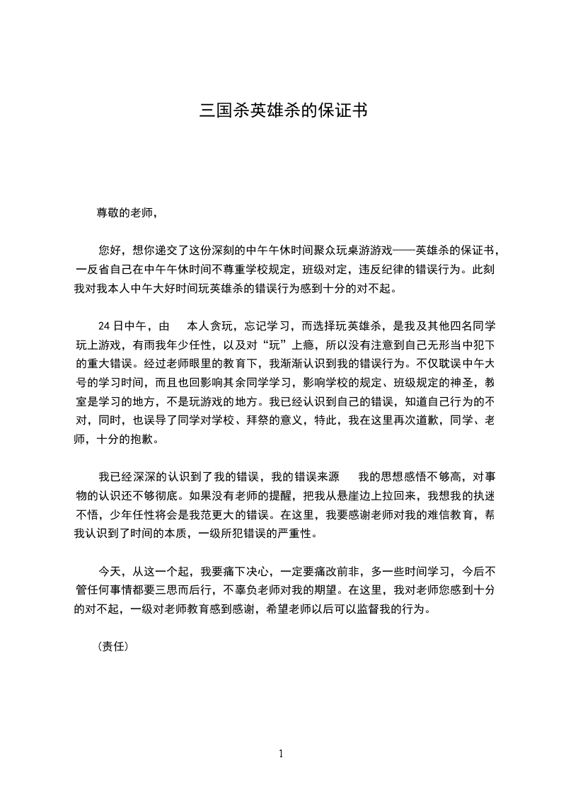 您好,想你递交了这份深刻的中午午休时间聚众玩桌游游戏——英雄杀的保证书,一反省自己在中午午休时间不尊重学校规定,班级对定,违反纪律的错误行为。此刻,我对我本人中午大好时间玩英雄杀的错误行为感到十分的对不起。