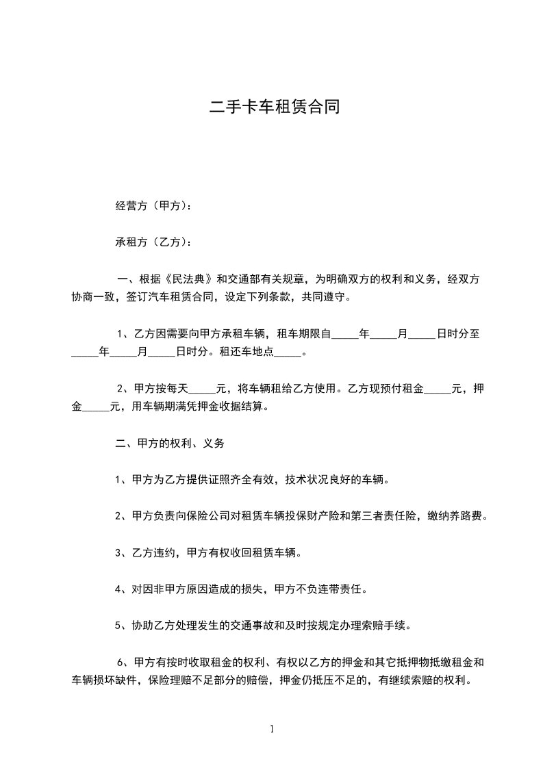 11、乙方在用车期满,应完好无缺损将车辆交给甲方。不得卸下里程表和故意损坏里程表,如有发生按日里程1000公里收费,不得更换车辆零部件。