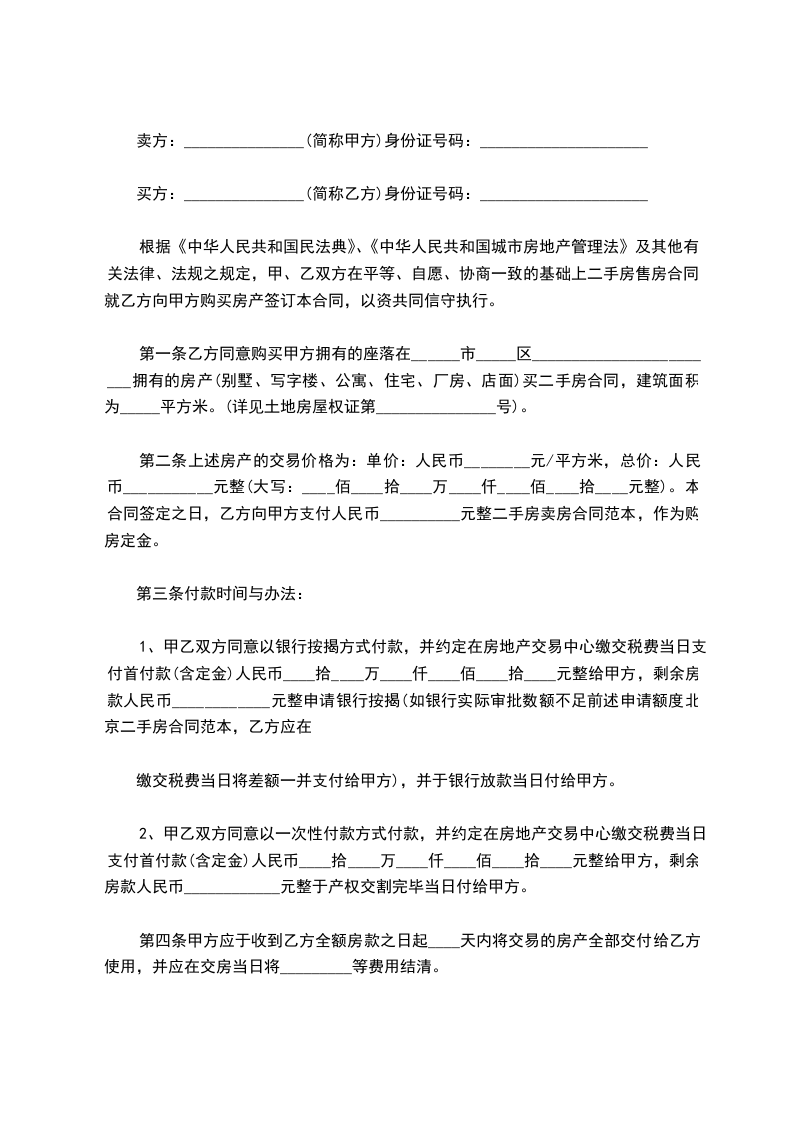 第二条上述房产的交易价格为:单价:人民币________元/平方米,总价:人民币___________元整(大写:____佰____拾____万____仟____佰____拾____元整)。本合同签定之日,乙方向甲方支付人民币__________元整二手房卖房合同范本,作为购房定金。