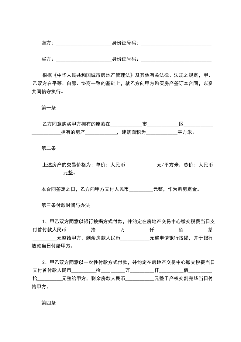 2、甲乙双方同意以一次性付款方式付款,并约定在房地产交易中心缴交税费当日支付首付款(含定金)人民币____拾____万____仟____佰____拾____元整给甲方,剩余房款人民币____________元整于产权交割完毕当日付给甲方。