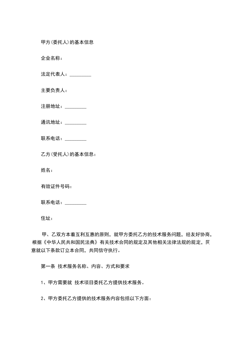 甲、乙双方本着互利互惠的原则,就甲方委托乙方的技术服务问题,经友好协商,根据《中华人民共和国民法典》有关技术合同的规定及其他相关法律法规的规定,同意就以下条款订立本合同,共同信守执行。