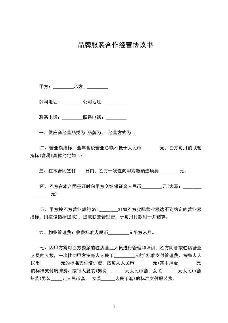 七、因甲方需对乙方委派的驻店营业人员进行管理和培训,乙方同意按驻店营业人员的人数,一次性向甲方按每人人民币_________元的`标准支付管理费、按每人人民币_________元的标准支付培训费,按每人人民币________元(其中押金________元)的标准支付胸牌费、按每人夏装(男装 ______元人民币套,女装_______元人民币套)冬装(男装_____元人民币套, 女装______人民币套)的标准支付服装费。