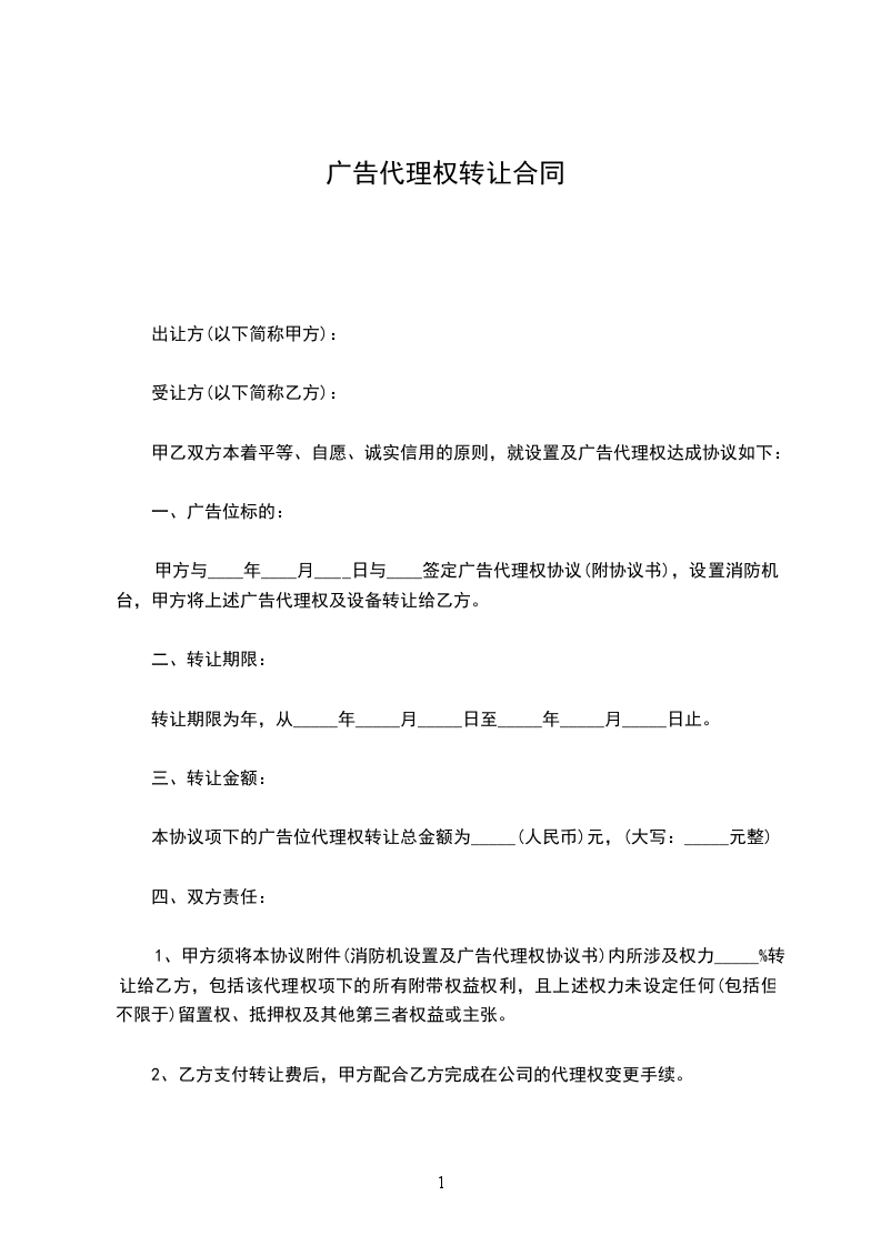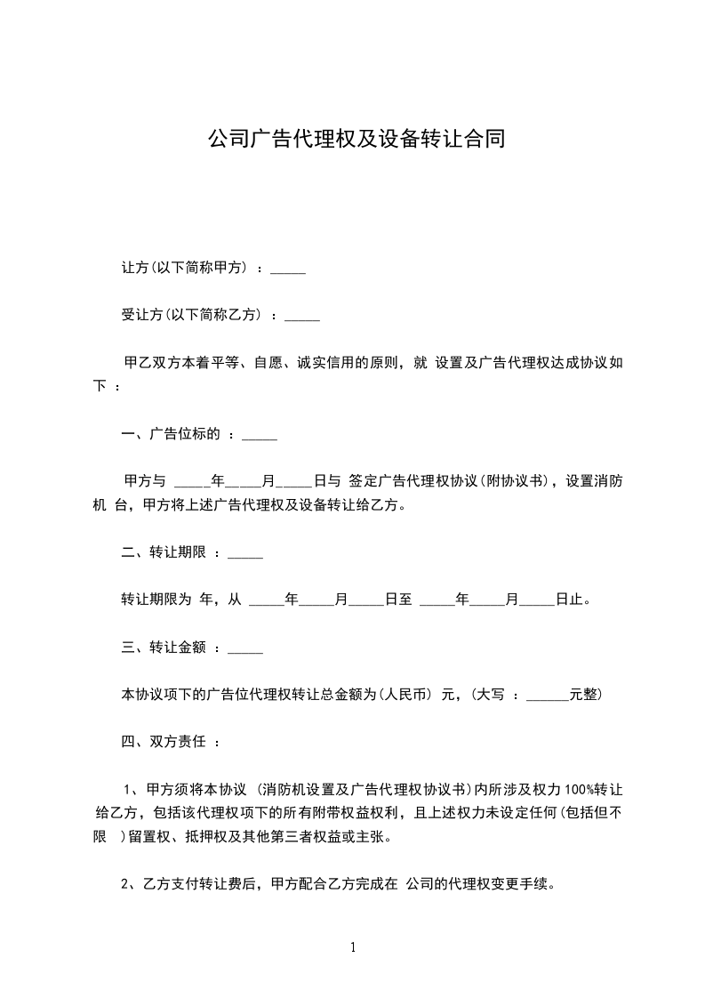 甲方与 ________年________月________日与 签定广告代理权协议(附协议书),设置消防机 台,甲方将上述广告代理权及设备转让给乙方。