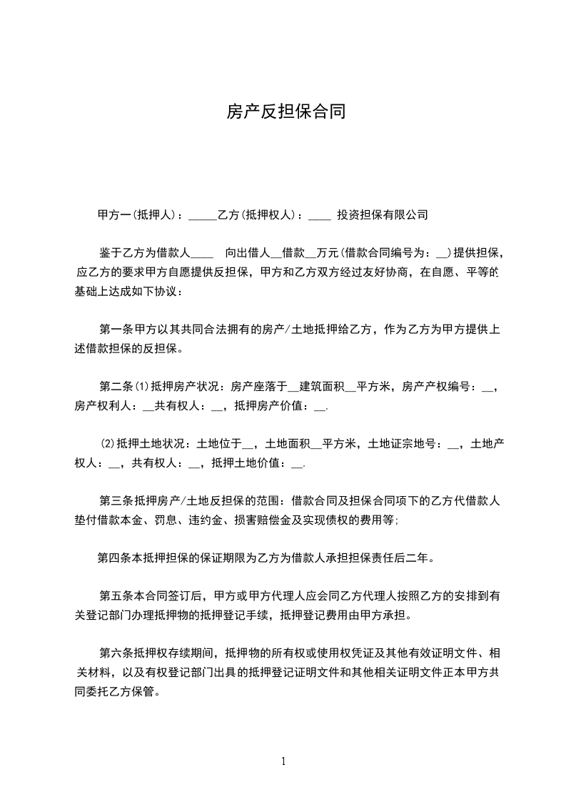 第一条甲方以其共同合法拥有的房产/土地抵押给乙方,作为乙方为甲方提供上述借款担保的反担保。