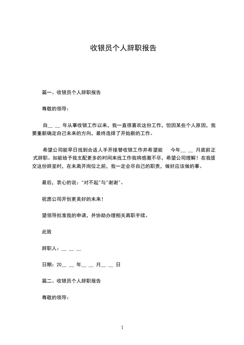 篇一、收银员个人辞职报告