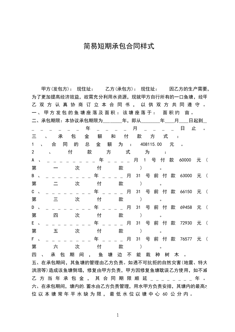 甲方(发包方): 现住址: 乙方(承包方): 现住址: 因乙方的生产需要,为了更加提高经济效益,故需充分利用水资源,现就甲方自行所有的一口鱼塘,经甲乙双方认真协商订立本合同书,以供双方共同遵守。