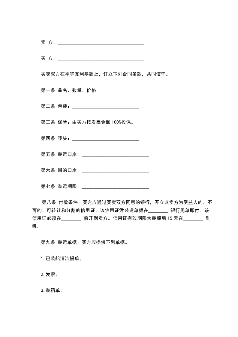 第九条 装运单据:买方应提供下列单据。