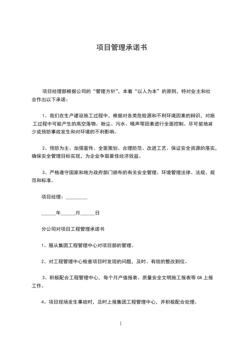 分公司对项目工程管理承诺书