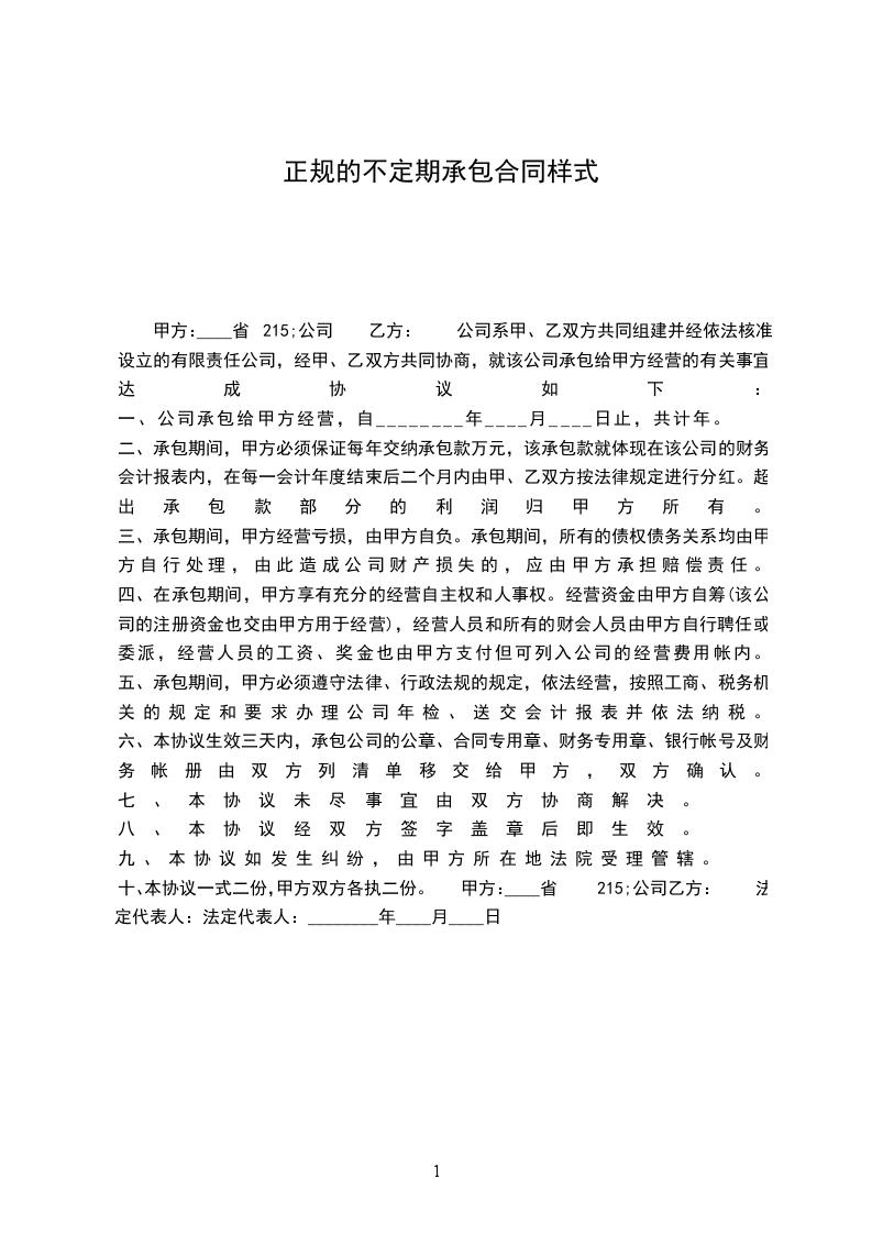 一、公司承包给甲方经营,自________年____月____日止,共计_____年。