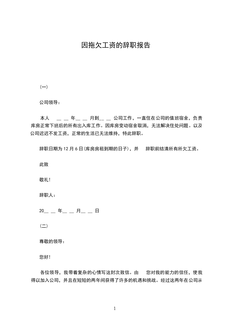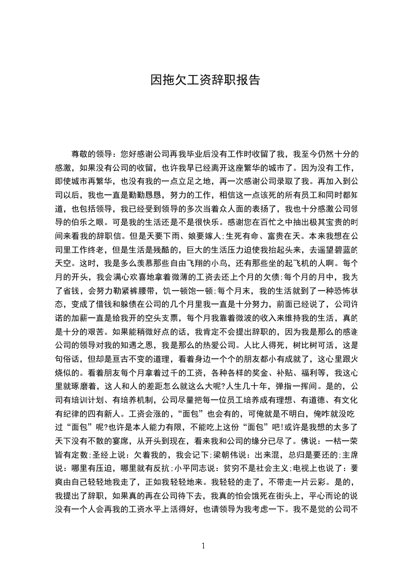 本人 __ __ 年__ __ 月到__ __ 公司工作,一直住在公司的值班宿舍,负责库房正常下班后的所有出入库工作。因库房变动宿舍取消,无法解决住处问题。以及公司迟迟不发工资,正常的生活已无法维持,特此申请辞职。
