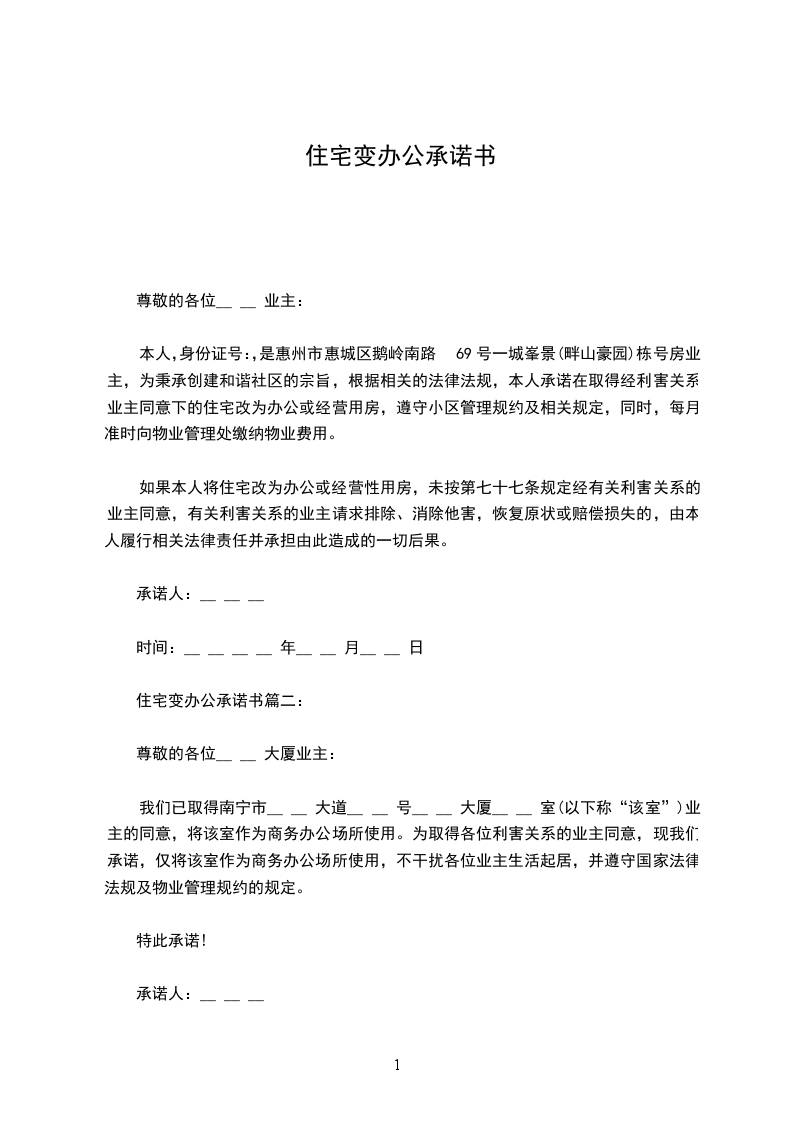 本人,身份证号:,是惠州市惠城区鹅岭南路69号一城峯景(畔山豪园)栋号房业主,为秉承创建和谐社区的宗旨,根据相关的法律法规,本人承诺在取得经利害关系业主同意下的住宅改为办公或经营用房,遵守小区管理规约及相关规定,同时,每月准时向物业管理处缴纳物业费用。