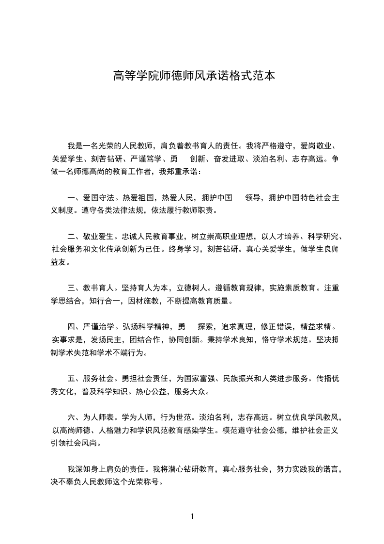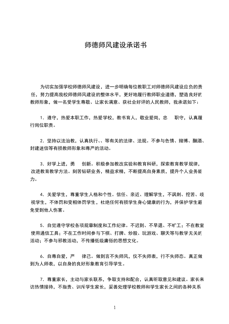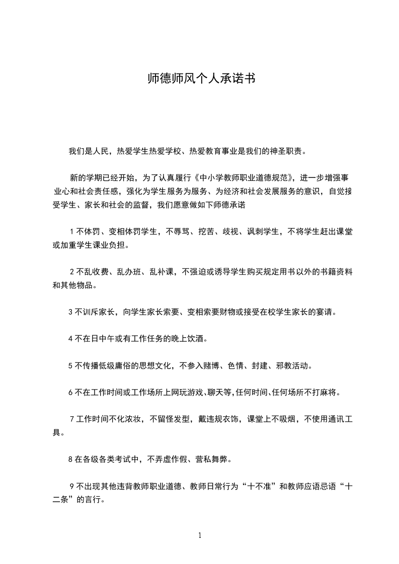 我是一名光荣的人民教师,肩负着教书育人的责任。我将严格遵守,爱岗敬业、关爱学生、刻苦钻研、严谨笃学、勇 创新、奋发进取、淡泊名利、志存高远。争做一名师德高尚的教育工作者,我郑重承诺:
