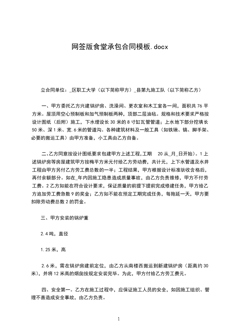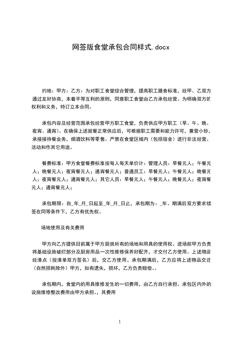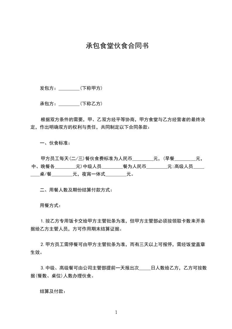 签约地:市 甲方: 乙方: 为对职工食堂综合管理,提高职工膳食标准,经甲、乙双方通过友好协商,本着平等互利的原则,同意职工食堂由乙方承包经营。为明确双方的权利和义务,特订立本合同。