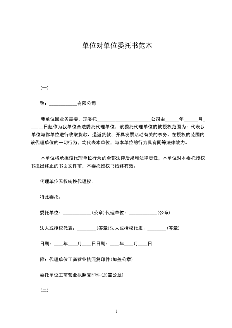 我单位因业务需要,现委托_______________________公司由______年______月______日起作为我单位合法委托代理单位,该委托代理单位的被授权范围为:代表我单位与你单位进行收取货款、退返货款、开具发票活动有关的事务。在授权的范围内,该代理单位的一切行为,均代表本单位,与本单位的行为具有同等法律效力。