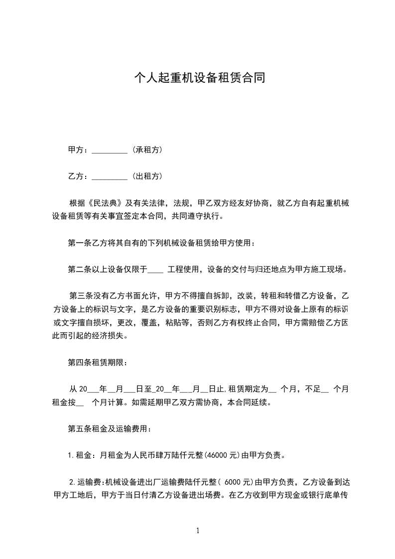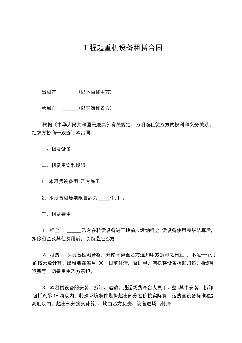 根据《民法典》及有关法律,法规,甲乙双方经友好协商,就乙方自有起重机械设备租赁等有关事宜签定本合同,共同遵守执行。