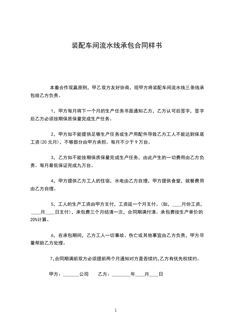 本着合作双赢原则,甲乙双方友好协商,现甲方将装配车间流水线三条线承包给乙方负责。