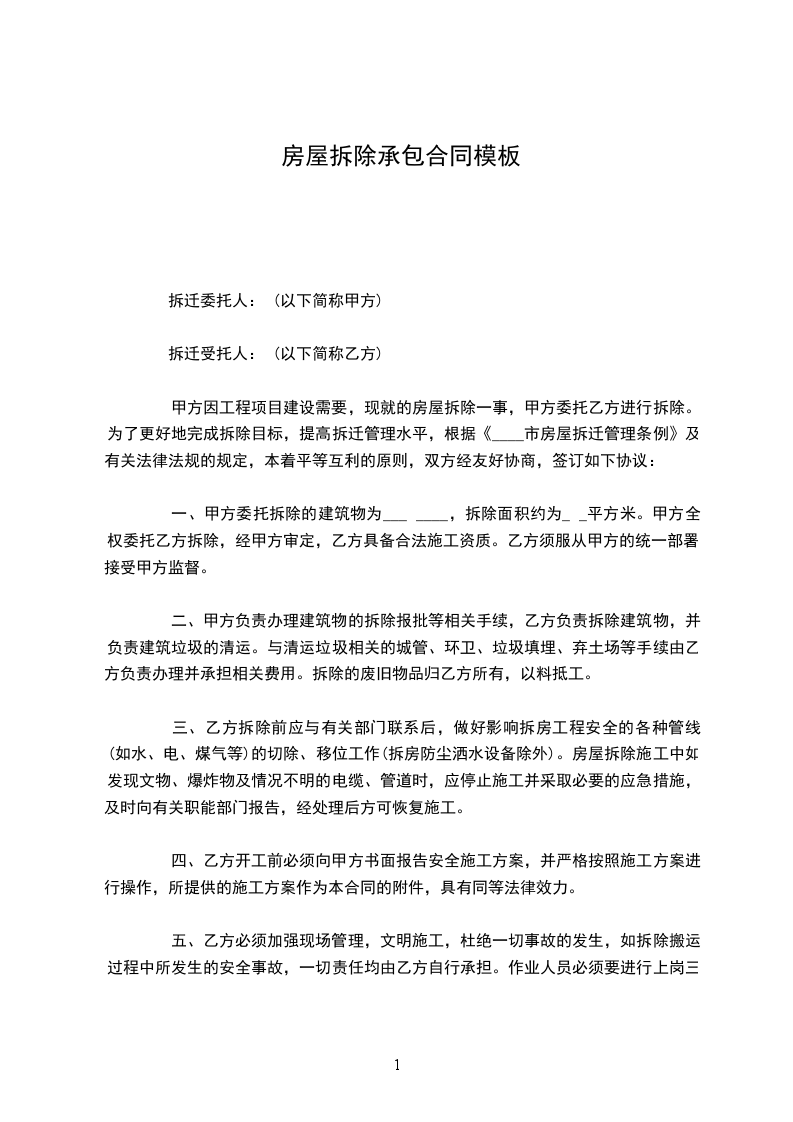 一、甲方委托拆除的建筑物为___ ____,拆除面积约为_ _平方米。甲方全权委托乙方拆除,经甲方审定,乙方具备合法施工资质。乙方须服从甲方的统一部署,接受甲方监督。