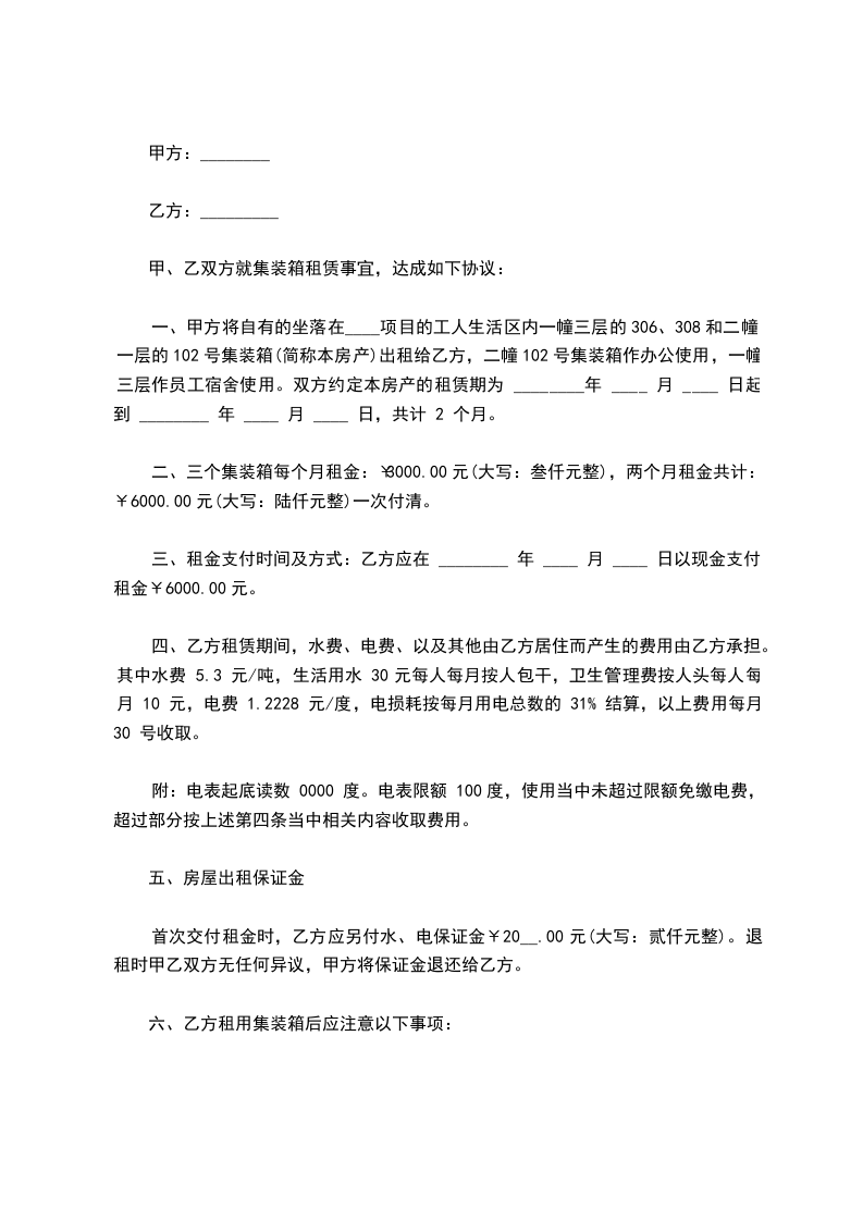 二、三个集装箱每个月租金:¥3000.00元(大写:叁仟元整),两个月租金共计:¥6000.00元(大写:陆仟元整)一次付清。